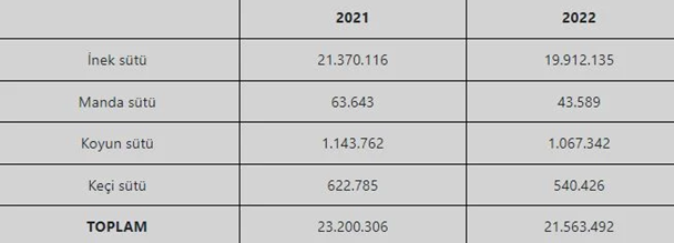 Bir önceki yıla göre manda sütü üretimi yüzde 31,5, keçi sütü üretimi yüzde 13,2, inek sütü üretimi yüzde 6,8 ve koyun sütü üretimi yüzde 6,7 azaldı.