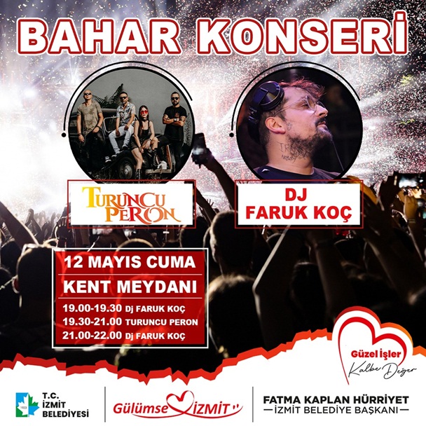 Bahar Konseri etkinliği çerçevesinde ilk olarak DJ Faruk Koç sahne alacak. Ardından gençlerin çok sevdiği Turuncu Peron müzik grubu birbirinden güzel şarkıları İzmitlilerle birlikte söyleyecek. İzmit Belediye Başkanı Fatma Kaplan Hürriyet’in de gençlerle buluşacağı konser programı DJ Faruk Koç’un tekrar sahne alması ile son bulacak.