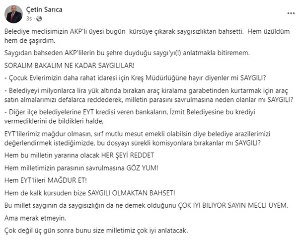 İzmit Belediyesi Başkanvekili Çetin Sarıca, sosyal medya hesabından yaptığı paylaşımda AKP’li meclis üyesinin meclise katılmadığı için İzmit Belediye Başkanı Fatma Kaplan Hürriyet’i eleştirmesine dair açıklamalarda bulundu. Sarıca paylaşımında şu ifadeleri kullandı; “Belediye meclisimizin AKP'li üyesi kürsüye çıkarak saygısızlıktan bahsetti. Hem üzüldüm hem de şaşırdım. Saygıdan bahseden AKP'lilerin bu şehre duyduğu saygı'yı (!) anlatmakla bitiremem.