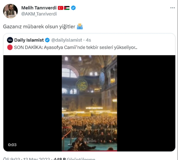 Tanrıverdi, Cumhurbaşkanı ve AKP Genel Başkanı Recep Tayyip Erdoğan'ın Ayasofya ziyareti ve kılınan namaza ilişkin görüntülere "Gazanız mübarek olsun yiğitler" yorumu yaptı.