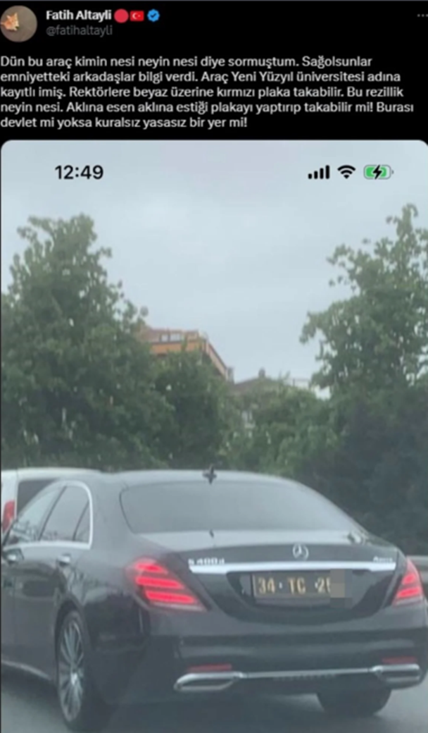 Aracın Yeni Yüzyıl Üniversitesi adına kayıtlı olduğu bilgisini paylaşan Altaylı, rektörlerin beyaz üzerine kırmızı plaka alabileceğini hatırlatarak duruma tepki gösterdi.