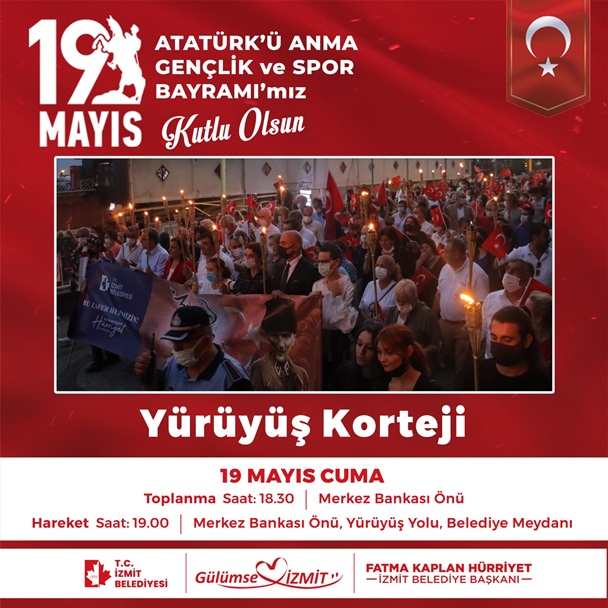 19 Mayıs Atatürk’ü Anma, Gençlik ve Spor Bayramı kutlamaları kapsamında yarın saat 18.30’da Merkez Bankası önünden İzmit Belediye Meydanına kadar yürüyüş korteji gerçekleştirilecek. Başkan Hürriyet, tüm İzmitlileri yürüyüş kortejine davet etti.
