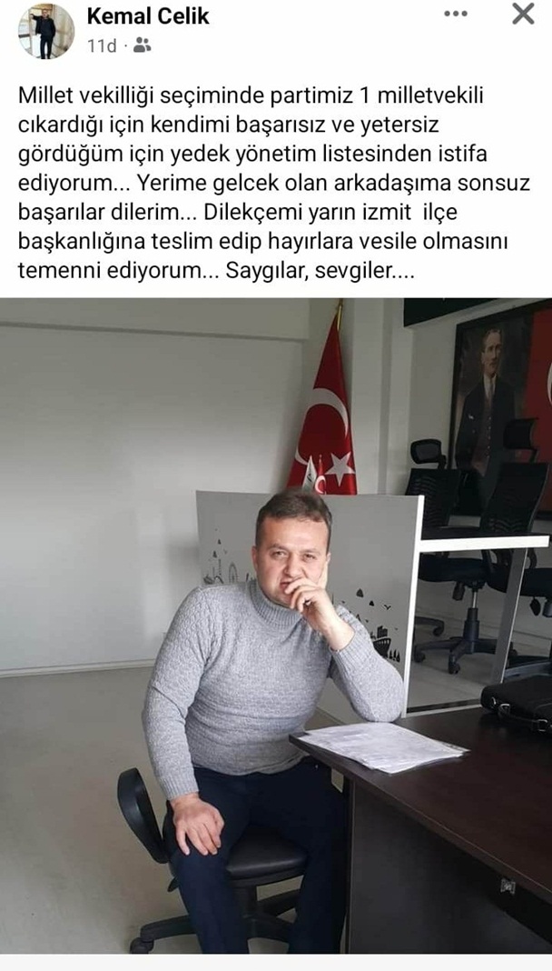 Seçimlerin kaybedeni olan İYİ Parti’de İzmit ilçe yedek yönetim kurulu üyesi Kemal Çelik, Kocaeli’de sadece 1 milletvekili çıkardık, bu sonuçla ilgili kendimi başarısız ve yetersiz gördüğüm için görevimden istifa ediyorum dedi.