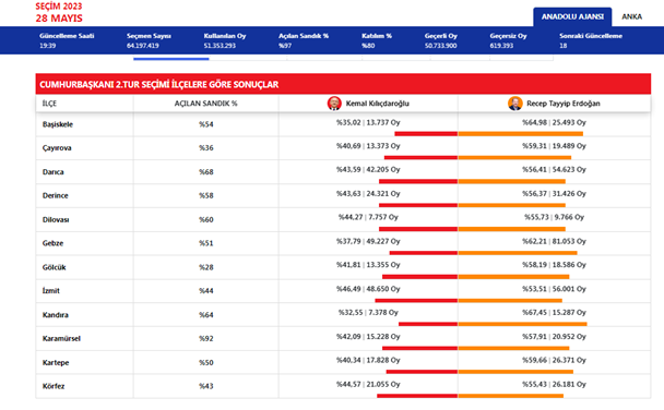 Kesin olmayan sonuçlara göre Kocaeli'de Tayyip Erdoğan yüzde 57,12, Kemal Kılıçdaroğlu'da yüzde 41, 88 oy aldı.