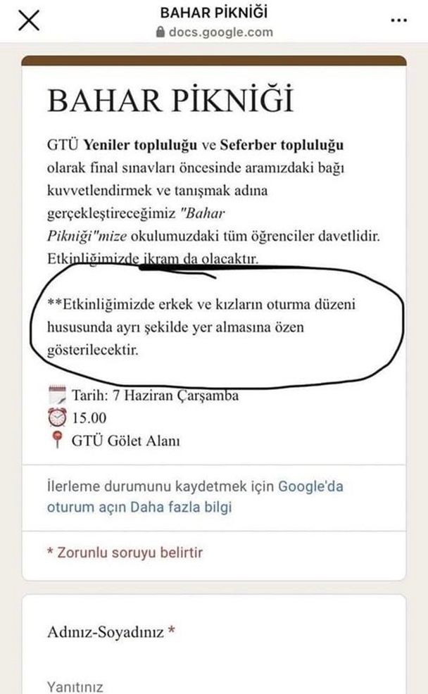 Başkan Sarı açıklamasında şu ifadelere yer verdi: ”Eğitimde fırsat eşitliğini sadece öğrencilerin kılık, kıyafeti, inançları üzerinden ‘savunduk’ gibi göstermeye çalışanların üniversite çatısı altında haremlik selamlık oturma düzeni ile sosyal etkinlik yapılması müsaade etmesi akıl tutulmasıdır. Yeniler Topluluğu ve Seferber Topluluğu adlı iki öğrenci topluluğunun ‘Kız ve erkek öğrencilerin ayrı şekilde oturmasına özen gösterilecektir’ notu ile paylaştığı duyuruya rektörlükten izin çıkması işte tam da bu aklın ürünüdür.