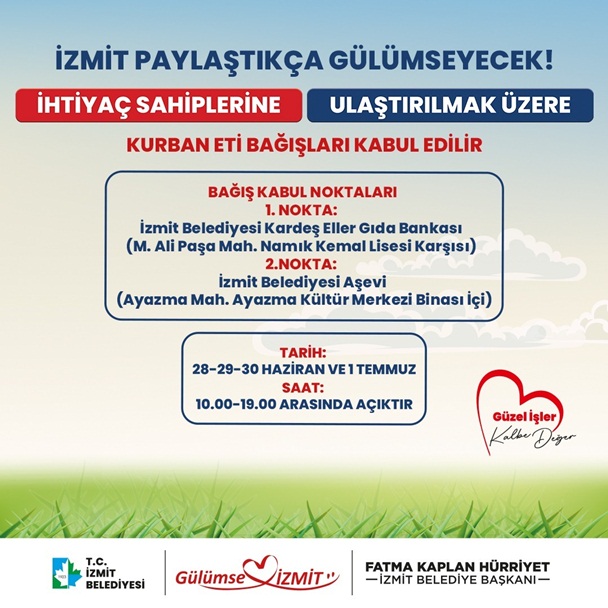 Sosyal belediyecilik anlayışıyla çalışmalarını sürdüren İzmit Belediyesi, bu yıl da Kurban Bayramı’nda hayırseverler ve ihtiyaç sahipleri arasında gönül köprüsü kuracak. Kurban Bayramı’nda 4 gün boyunca hayırseverlerin bağışlayacağı etleri kabul edecek olan İzmit Belediyesi, bağışlanan etleri daha öncesinde uzmanlar tarafından tespit edilen ihtiyaç sahibi aileleri eşit bir şekilde pay edecek. Aşevi ve Gıda Bankası bayram boyunca 10.00 – 19.00 saatleri arasında açık olacak.
