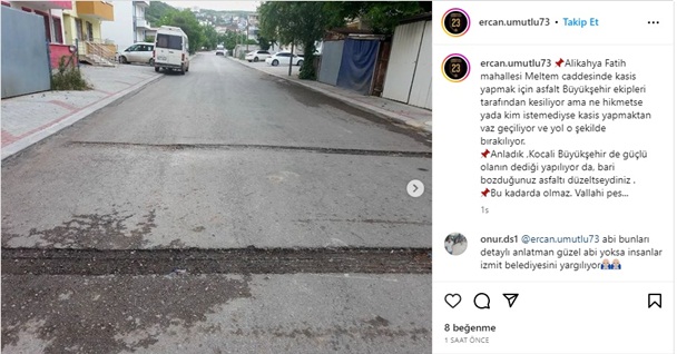 İzmit Belediyesi Muhtar Hizmet Masası Komisyon Üyesi Ercan Umutlu, Kocaeli Büyükşehir Belediyesi tarafından Alikahya Fatih Mahallesi’nde bozulan asfaltın fotoğrafını paylaşarak eleştirilerde bulundu. Ercan Umutlu paylaşımında şu ifadeleri kullandı; “Alikahya Fatih Mahallesi Meltem Caddesinde kasis yapmak için asfalt Büyükşehir ekipleri tarafından kesiliyor ama ne hikmetse ya da kim istemediyse kasis yapmaktan vaz geçiliyor ve yol o şekilde bırakılıyor. Anladık, Kocaeli Büyükşehir’de güçlü olanın dediği yapılıyor da, bari bozduğunuz asfaltı düzeltseydiniz. Bu kadarda olmaz. Vallahi pes...”