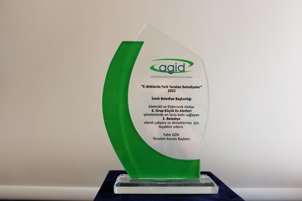 6 belediyenin ödül aldığı yarışmada 2022 yılında topladıkları e-atık miktarları ile e-atık yönetim sistemine en yüksek katkıyı sağlayan ve "Elektrikli ve Elektronik Atık Yönetiminde Fark Yaratan Belediyeler" kategorisinde diğer belediyelere de örnek olan İzmit Belediyesi AGİD’in ticari işletmesi tarafından ‘Küçük Ev Aletleri’ kategorisinde geçen sene olduğu gibi bu sene de 102 belediye arasından topladığı 16 bin 700 kilogram atıkla en çok fark yaratan ikinci belediye oldu.