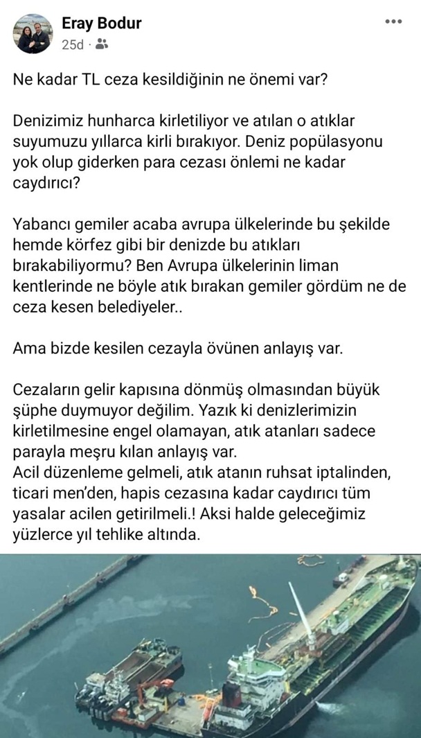 İzmit Belediyesi STK ve Esnaf Masası Koordinatörü Eray Bodur sosyal medya hesabından yaptığı paylaşımda Körfezi kirleten gemilere verilen cezayla övünen bir anlayış olduğunu ifade etti. Bodur paylaşımında şu ifadeleri kullandı: "Ne kadar TL ceza kesildiğinin ne önemi var? Denizimiz hunharca kirletiliyor ve atılan o atıklar suyumuzu yıllarca kirli bırakıyor. Deniz popülasyonu yok olup giderken para cezası önlemi ne kadar caydırıcı?
