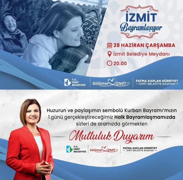 Halk Bayramlaşması Programı kapsamında saat 15.30’da çocuklar için belediye önünde etkinlikler başlayacak. Sonrasında saat 20.00’da ise İzmit Belediye Başkanı Fatma Kaplan Hürriyet’in katılımıyla Halk Bayramlaşması yapılacak. Başkan Hürriyet Halk Bayramlaşmasına tüm İzmitlileri davet etti.