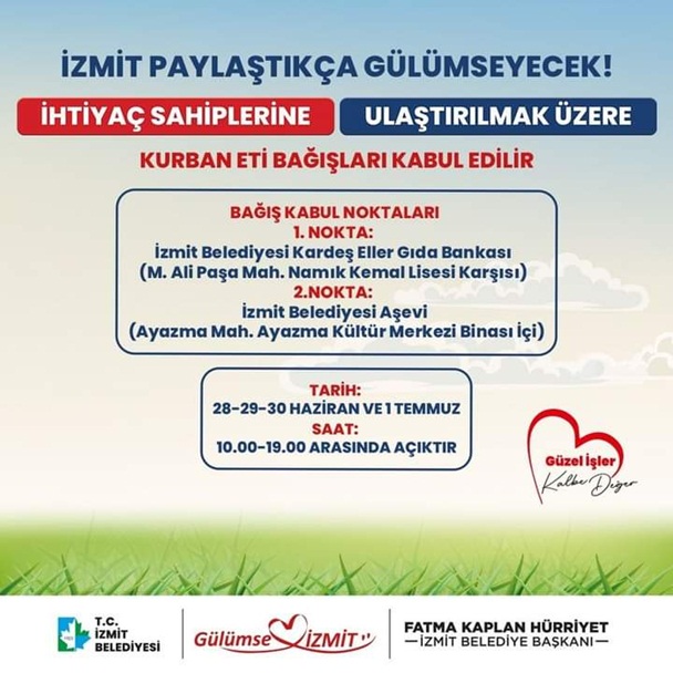 İzmit Belediyesi, bu yıl da Kurban Bayramı’nda hayırseverler ve ihtiyaç sahipleri arasında gönül köprüsü kuracak. Kurban Bayramı boyunca hayırseverlerin bağışlayacağı etleri kabul edecek olan İzmit Belediyesi, bağışları ihtiyaç sahibi ailelere eşit bir şekilde pay edecek. Aşevi ve Gıda Bankası, bayram boyunca 10.00 – 19.00 saatleri arasında bağış kabul etmek için açık olacak.