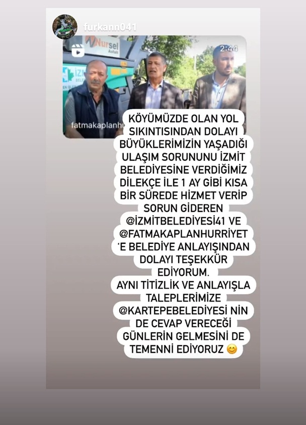 Orhaniye Mahallesi sakinlerinden Furkan Tokdemir de sosyal medya hesabından yaptığı paylaşımda şu ifadeleri kullandı: Köyümüzde olan yol sıkıntısından dolayı büyüklerimizin yaşadığı ulaşım sorununu İzmit Belediyesine verdiğimiz dilekçe ile 1 ay gibi kısa bir sürede hizmet verip sorun gideren İzmit Belediyesi ve Başkan Fatma Kaplan Hürriyet’e teşekkür ediyorum. Aynı titizlik ve anlayışla taleplerimize Kartepe Belediyesinin de cevap vereceği günlerin gelmesini de temenni ediyoruz.