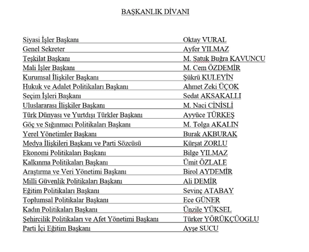 İYİ Parti’de olağan kurultay süreci sonrasında Başkanlık Divanı belli oldu. Yeni yönetimde kurultay öncesinde partiye katılan Oktay Vural Siyasi İşler Başkanı oldu. Öte yandan teşkilat Başkanlığı görevine Buğra Kavundu getirildi. Kürşat Zorlu, Naci Cinisli, Şükrü Kuleyn ve Bilge Yılmaz da parti yönetiminde yer aldı.