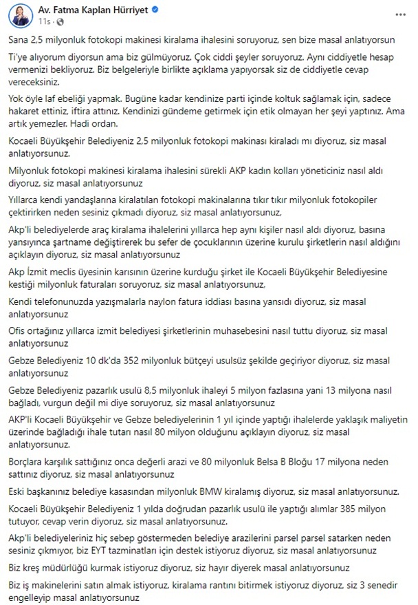 İzmit Belediye Başkanı Fatma Kaplan Hürriyet sosyal medya hesabından yaptığı paylaşımda AKP’li meclis üyelerinin iddialarına ve 'masal anlatıyorsunuz' ifadelerine kapsamlı bir yanıt verdi. Hürriyet paylaşımında şu ifadeleri kullandı;"Sana 2,5 milyonluk fotokopi makinesi kiralama ihalesini soruyoruz, sen bize masal anlatıyorsun. Ti'ye alıyorum diyorsun ama biz gülmüyoruz. Çok ciddi şeyler soruyoruz. Aynı ciddiyetle hesap vermenizi bekliyoruz. Biz belgeleriyle birlikte açıklama yapıyorsak siz de ciddiyetle cevap vereceksiniz.