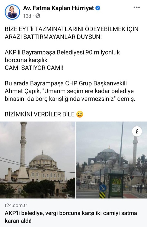 İzmit Belediye Başkanı Fatma Kaplan Hürriyet sosyal medya hesabından yaptığı paylaşımda kendilerine EYT’lilerin tazminatlarını ödeyebilmek için arazi sattırmayanlara seslenerek, AKP’li Bayrampaşa Belediyesinin borcunu ödeyebilmek için cami sattığını ifade etti