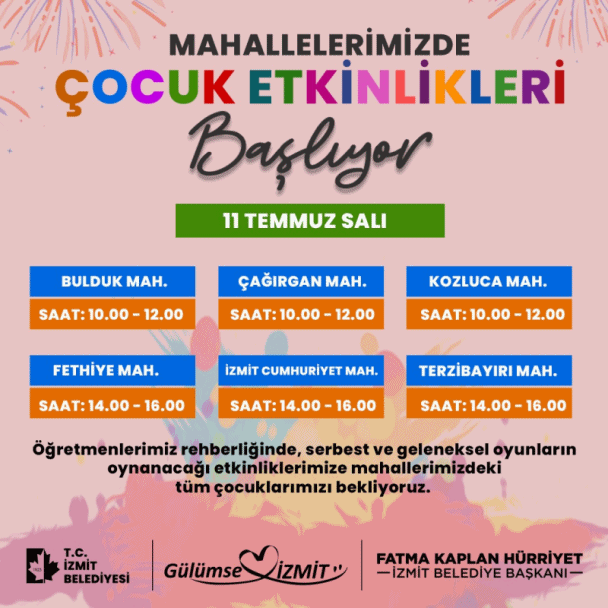 11 Temmuz Salı günü ise 10.00-12.00 saatleri arasında Bulduk, Çağırgan ve Kozluca mahalleleri, 14.00-16.00 saatleri arasında da Fethiye, Cumhuriyet ve Terzibayırı mahallelerinde etkinlikler devam edecek. İzmit Belediyesi, öğretmenlerin rehberliğinde serbest ve geleneksel oyunların oynanacağı etkinliklere tüm çocukları davet etti.