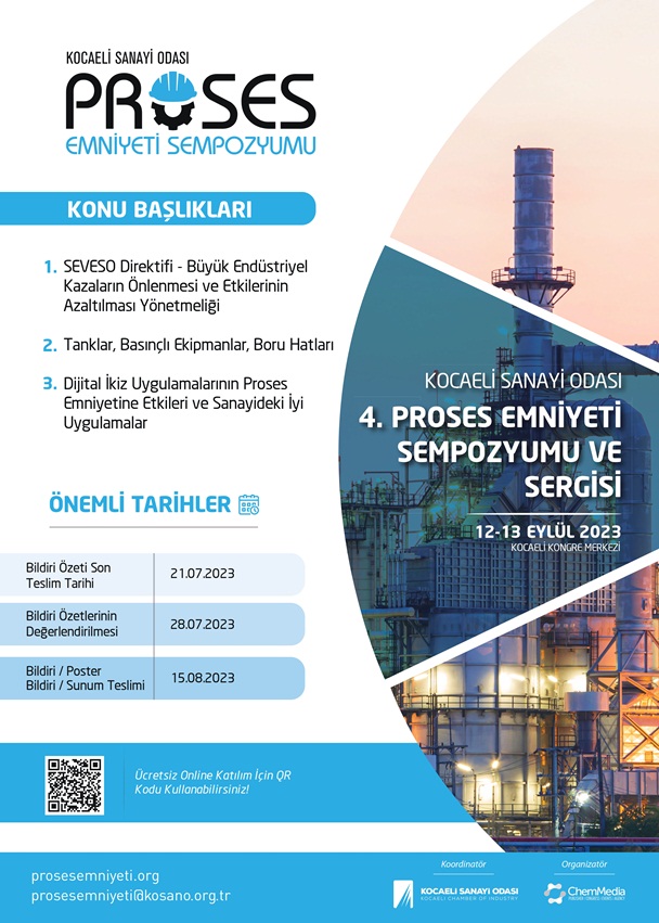 Üretim sanayisinin tüm paydaşları endüstriyel kazaların önüne geçmek için 12-13 Eylül 2023 tarihlerinde Kocaeli Kongre Merkezi’nde düzenlenecek Kocaeli Sanayi Odası 4. Proses Emniyeti Sempozyumu ve Sergisi’nde buluşmaya hazırlanıyor. Tehlikeli maddeler bulunduran kuruluşlarda, büyük endüstriyel kazaları önlemek ve muhtemel kazaların insanlara ve çevreye olan zararlarını en aza indirmek; yüksek seviyede, etkili ve sürekli korumayı sağlamak için alınması gerekli önlemler ile ilgili yönetmelik, uygulama, teknik bilgi, Ar-Ge, ürün ve hizmetlerin sektöre aktarılması amacıyla düzenlenen Sempozyum için kritik tarihler belirlendi. Bu kapsamda ‘Bildiri Özetleri’nin son teslim tarihi 21 Temmuz 2023 Cuma günü olarak belirlendi. Sunulan bildiri özetleri 28 Temmuz Cuma tarihine kadar değerlendirilecek. Ayrıca bildiri sunum teslimi için ise son tarih 15 Ağustos Salı günü olarak açıklandı.