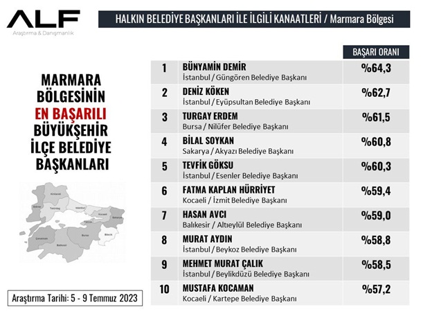 ALF Araştırma & Danışmanlık tarafından halkın belediye başkanları ile ilgili kanaatlerini tespit etmek amacıyla Marmara Bölgesi’nde 8 bin 800 kişi ile yüz yüze gerçekleştirdiği anket sonuçları açıklandı. Anket sonucunda göre İzmit Belediye Başkanı Fatma Kaplan Hürriyet, Marmara Bölgesi’nin En Başarılı 10 İlçe Belediye Başkanlarından biri olarak sıralamadaki yerini aldı.
