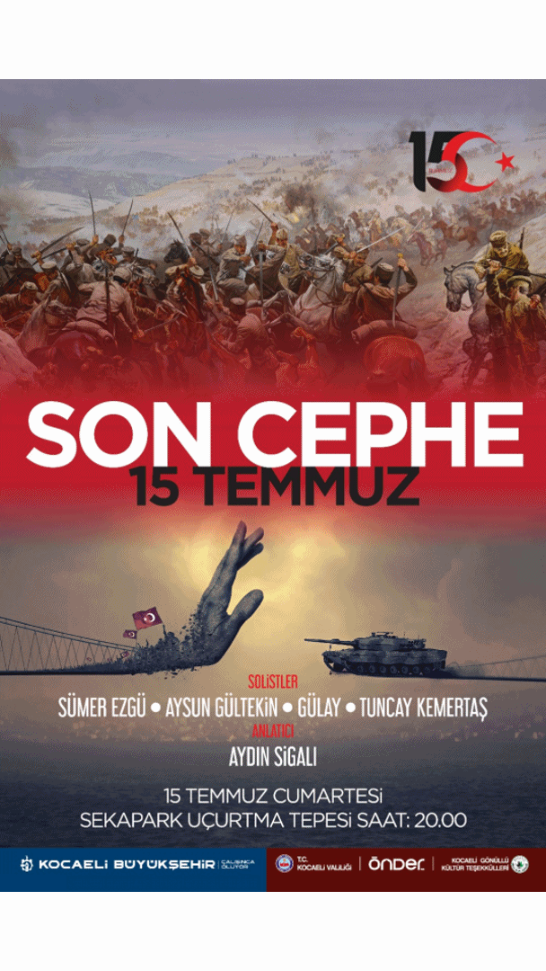 Kocaeli Büyükşehir Belediyesi, 15 Temmuz Demokrasi ve Millî Birlik Günü’nün 7. yıldönümünde anlatımlı ve müzikli gösterilerden oluşacak “Son Cephe 15 Temmuz” adlı anma programı hazırladı. Programa özel olarak hazırlanan metinde Kurtuluş Savaşı mücadelesi ile 15 Temmuz direnişinin benzerlikleri, bağımsızlık ülküsü ortak noktasından ele alınacak. Söz konusu anlatımda, konser, tiyatro, şiir, animasyon gösterileri yer alacak. Yaklaşık 75 dakika sürecek olan programın anlatıcılığını Büyükşehir Şehir Tiyatroları Genel Sanat Yönetmeni Aydın Sigalı üstlenecek.