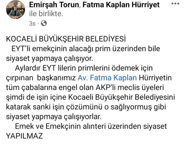 İzmit Belediyesi Başkan Yardımcısı Emirşah Torun sosyal medya hesabından yaptığı paylaşımda, AKP’li meclis üyelerini eleştirdi. Torun paylaşımında, “Kocaeli Büyükşehir Belediyesi EYT’li emekçinin alacağı prim üzerinden bile siyaset yapmaya çalışıyor. Aylardır EYT’lilerin primlerini ödemek için çırpınan başkanımız Av. Fatma Kaplan Hürriyetin tüm çabalarına engel olan AKP’li meclis üyeleri şimdi de işin içine Kocaeli Büyükşehir Belediyesini katarak sanki işin çözümünü o sağlıyormuş gibi siyaset yapmaya çalışıyorlar. Emek ve Emekçinin alın teri üzerinden siyaset yapılmaz” ifadelerini kullandı.