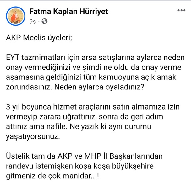 Başkan Hürriyet yaptığı açıklamada, “AKP Meclis üyeleri; EYT tazminatları için arsa satışlarına aylarca neden onay vermediğinizi ve şimdi ne oldu da onay verme aşamasına geldiğinizi tüm kamuoyuna açıklamak zorundasınız. Neden aylarca oyaladınız? 3 yıl boyunca hizmet araçlarını satın almamıza izin vermeyip zarara uğrattınız, sonra da geri adım attınız ama nafile. Ne yazık ki aynı durumu yaşatıyorsunuz. Üstelik tam da AKP ve MHP İl Başkanlarından randevu istemişken koşa koşa büyükşehire gitmeniz de çok manidar...!” dedi.