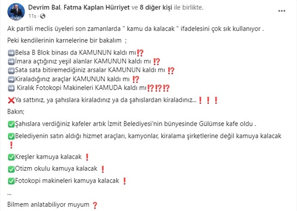 İzmit Belediyesi CHP’li meclis üyesi Devrim Bal sosyal medya hesabından yaptığı paylaşımda, “Ak Partili meclis üyeleri son zamanlarda "kamuda kalacak" ifadelerini çok sık kullanıyor. Peki kendilerinin karnelerine bir bakalım. Belsa B Blok binası da kamunun kaldı mı? İmara açtığınız yeşil alanlar kamunun kaldı mı? Sata sata bitiremediğiniz arsalar kamunun kaldı mı? Kiraladığınız araçlar kamunun kaldı mı? Kiralık fotokopi makineleri kamuda kaldı mı? Ya sattınız, ya şahıslara kiraladınız ya da şahıslardan kiraladınız.