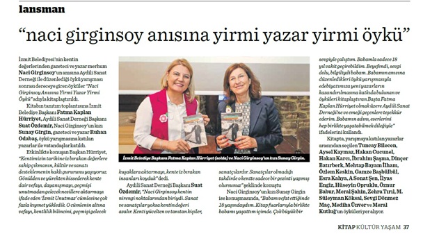 İzmit Belediyesi, kentimizin değeri merhum Gazeteci, Yazar Naci Girginsoy anısına geçtiğimiz yıl Aydili Sanat Derneği işbirliğiyle öykü yarışması düzenlemişti. Yarışmada dereceye giren öyküleri kitaplaştırarak “Naci Girginsoy Anısına Yirmi Yazar Yirmi Öykü” adını veren İzmit Belediyesi, kitabın lansmanını da yazarlar ile birlikte yapmıştı.