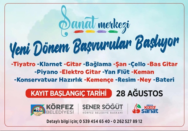 Körfez Belediyesi tarafından geçtiğimiz yıl hizmete açılan Sanat Merkezi’nde yeni dönem kayıtları başlıyor. Yavuz Sultan Selim Mahallesi Osman Gazi Caddesi No:10’da (Emlak Konut Eski Satış Ofisi) bulunan Sanat Merkezi’nde kayıtlar 28 Ağustos itibari ile başlayacak. Kurslardan 7-25 yaş arası Körfezliler ücretsiz olarak faydalanabilecek.