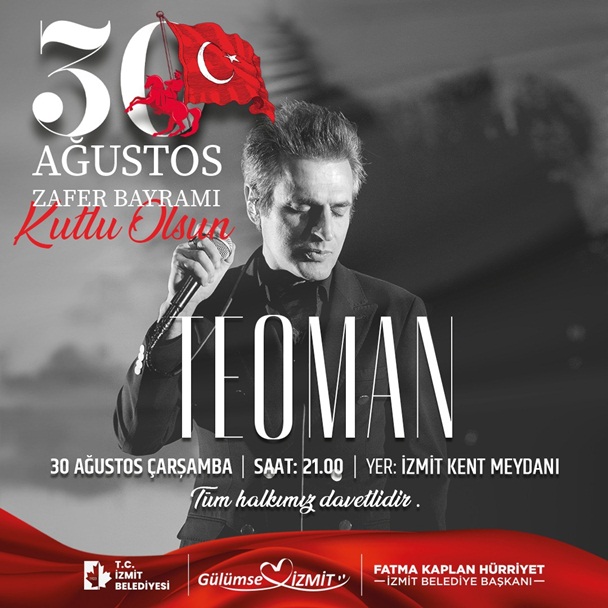 İzmit’te milli bayramları ruhuna uygun yaşatan ve büyük bir coşkuya ev sahipliği yapan İzmit Belediyesi, 30 Ağustos Zafer Bayramı’nı bu yıl da adına yakışır şekilde kutlayacak. İzmit Belediyesi 30 Ağustos Zafer Bayramı kutlamaları için dopdolu bir program hazırladı. Gün boyu sürecek kutlama etkinliklerinin finalinde ünlü şarkıcı Teoman birbirinden güzel şarkılarıyla Kent Meydanı’nda sahne alacak.