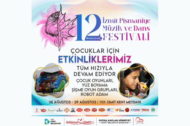 12. Uluslararası İzmit Pişmaniye Müzik ve Dans Festivali 3 gün boyunca İzmit Kent Meydanında dolu dolu geçti. Özellikle çocuk etkinlikleri miniklerin büyük beğenisini topladı. Alandaki etkinlikler bugün ve yarın da sürecek. Saat 16.00 ile 23.00 arasındaki program kapsamında çocuk oyunları, yüz boyama, şişme oyun grupları ve robot adam gibi eğlenceli aktiviteler gerçekleştiriliyor. İzmit Belediyesi yetkilileri tüm minikleri doyasıya eğlenmek için Kent Meydanında gerçekleştirilen Çocuk Etkinliklerine beklediklerini ifade etti.