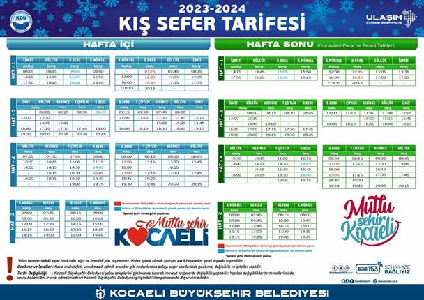 Kocaeli Büyükşehir Belediyesi, Deniz ulaşımında kış sefer tarifesi uygulamasına 11 Eylül Pazartesi günü itibariyle başlıyor. Buna göre Hat 1 İzmit-Gölcük-Değirmendere-Karamürsel, Hat 2 Karamürsel-Hereke, Hat 3 İzmit-Gölcük-Derince-Tütünçiftlik-Değirmendere, Hat 4 ise Gölcük-Derince-Tütünçiftlik-Değirmendere güzergâhı arasında gidiş dönüş olarak 11 Eylül Pazartesi gününden itibaren kış tarifesine geçecek. Deniz ulaşımında kış sefer tarifesi Büyükşehir’in www.kocaeli.bel.tr internet sitesinde bulunan “Vapur Saatleri” linkinden takip edilebilir.