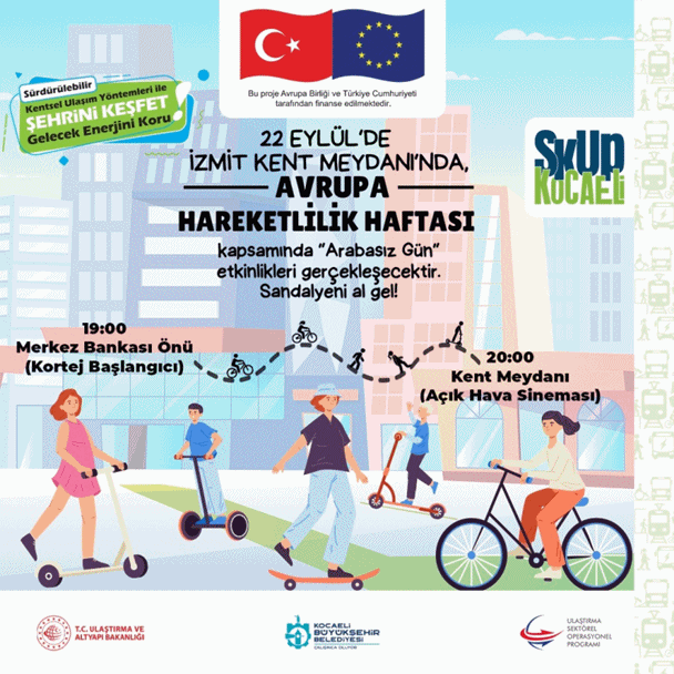 Avrupa Komisyonu’nun bir girişimi olan ve 2002 yılından bu yana düzenli olarak her yıl 16-22 Eylül tarihleri arasında Avrupa kıtasındaki yerel yönetimler ve paydaş kuruluşlarca kutlanan Avrupa Hareketlilik Haftası, tüm dünyada ve Türkiye’de olduğu gibi Kocaeli’de de Büyükşehir Belediyesi’nin düzenlediği etkinliklerle kutlanmaya devam ediliyor. Karbon emisyonunun azaltılması, hava kalitesinin artırılması ile çevre dostu ulaşım yöntemlerinden bisiklet sürmek ve yürüyüş yapmayı teşvik eden organizasyonlarda sıra “Arabasız Gün” etkinliğine geldi. 22 Eylül Cuma günü İzmit’te saat 19.00’da Merkez Bankası'nın önünden başlayacak yürüyüş korteji, saat 20.00’de İzmit Kent Meydanı’nda açık hava sinema gösterimiyle son bulacak.