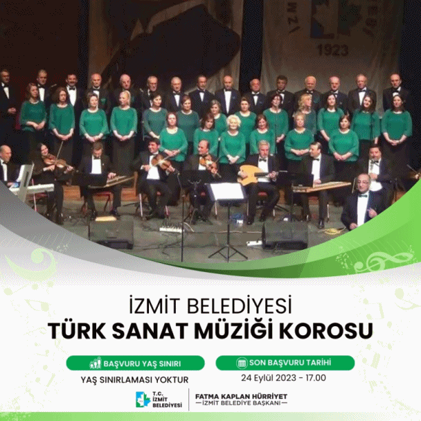 Sanat kenti İzmit vizyonu ile çalışmalarını sürdüren İzmit Belediyesi Kültür ve Sosyal İşler Müdürlüğü bünyesindeki koro başvuruları başladı. Türk Sanat Müziği Korosu ve Türk Halk Müziği Uygulama Topluluğu için yaş sınırlaması bulunmazken Türk Halk Müziği Gençlik Korosu için 16-30 yaş arasındaki vatandaşlar başvurularını 24 Eylül tarihine kadar başvuru formlarını doldurarak gerçekleştirebilecek.