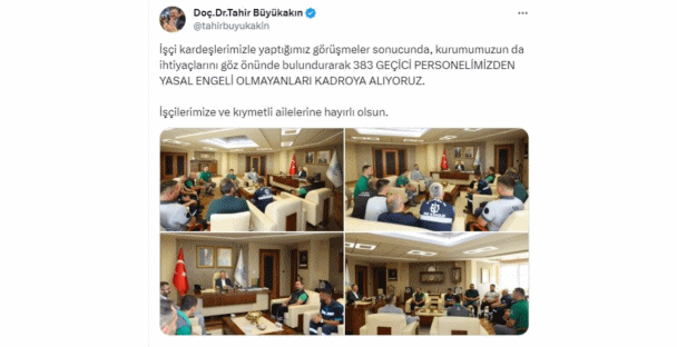 Başkan Tahir Büyükakın, sosyal medya hesaplarından müjdeli haberi şu şekilde duyurdu: “İşçi kardeşlerimizle yaptığımız görüşmeler sonucunda, kurumumuzun da ihtiyaçlarını göz önünde bulundurarak 383 geçici personelimizden yasal engeli olmayanları kadroya alıyoruz. İşçilerimize ve kıymetli ailelerine hayırlı olsun.”