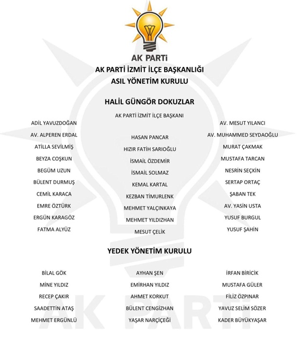 AKP İzmit’te Muharrem Tutuş’un belediye başkan adaylığı için görevinden istifa etmesinden sonra ilçe başkanı olarak atanan Halil Güngör Dokuzlar’ın listesi de onaylandı.
