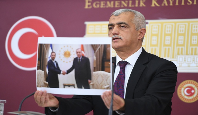 Genel kurulda fotoğraflar göstererek kanıtlarıyla gerçekleri anlattığını vurgulayan Gergerlioğlu, “Bu kim? Şimon Peres. Burası neresi? Bu meclis. Arkasında kim duruyor? Cumhurbaşkanı Erdoğan. Bu Mecliste konuşuyor. "Gazi Meclis, Gazi Meclis" dersiniz, katiller konuşturursunuz burada. İkinci olarak Bu kim? İsrail Cumhurbaşkanı Herzog. Onunla el sıkışan kim? Yine Cumhurbaşkanı Erdoğan. Ne zaman oldu? Bir yıl önce. En üst düzey protokolle karşıladınız Ankara'da. İlişkilerin İsrail ile en üst düzeye çıkması istendi. Böyle mi olacaktı?” dedi.