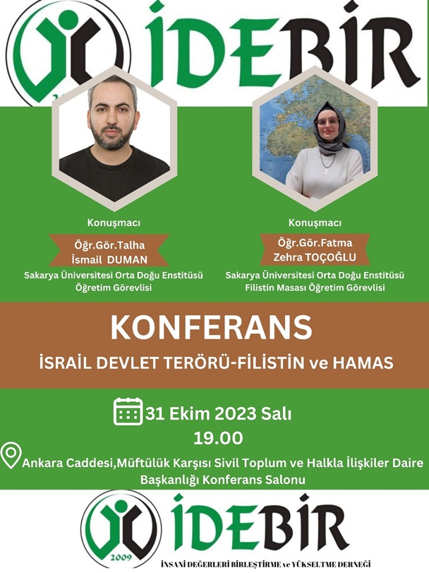 Kısa adı İDEBİR olan Zeki Canşi Başkanlığı’ndaki İnsani Değerleri Birleştirme ve Yükseltme Derneği yönetimi İsrail devlet terörü-Filistin ve Hamas konulu konferans düzenledi.
