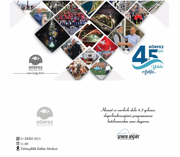 Körfez Belediye Başkanı Şener Söğüt, göreve geldiği günden bu güne kadar Körfez’e kazandırılan hizmet ve eselerin anlatılacağı büyük bir tanıtım toplantısı gerçekleştirecek. 31 Ekim Salı günü Tütünçiftlik Kültür Merkezi’nde düzenlenecek program, saat 11.00’da başlayacak.