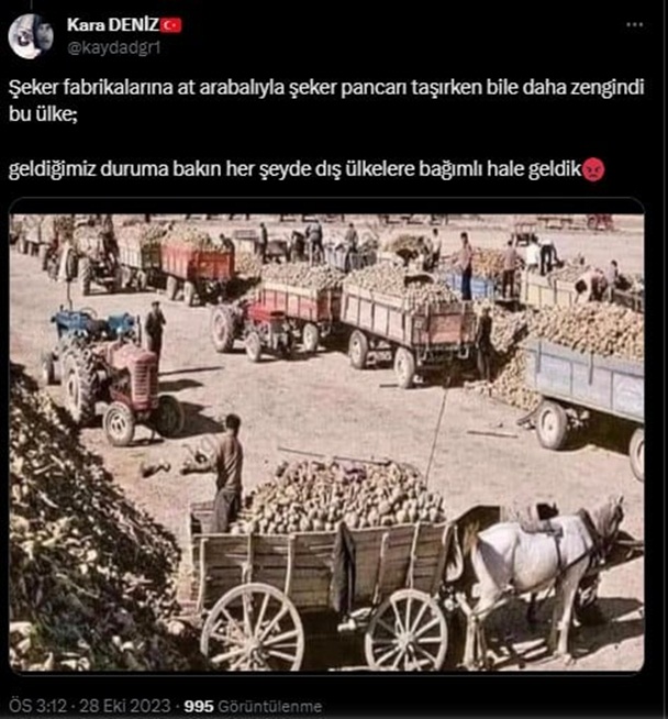 Şeker fabrikalarına at arabalarıyla şeker pancarı taşırken bile daha zengindi bu ülke; geldiğimiz duruma bakın her şeyde dış ülkelere bağımlı hale geldik.