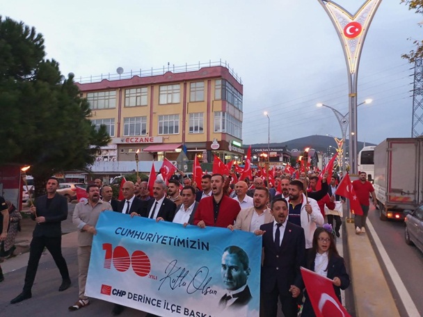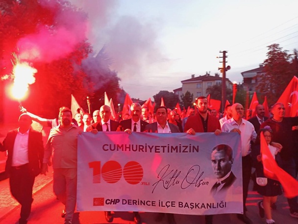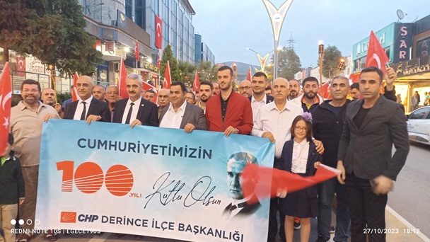 CHP Derince ilçe başkanı Atasoy bilgin ve yönetimi Cumhuriyetimizin kuruluşunun 100. Yılına yakışır bir kutlama yaptı. Saat 18.00 da Yenikent Mahallesi muhtarlığı önünde parti üyeleri ile birlikte meşalelerle yürüyüş başlatan ilçe yönetimi ve vatandaşların katılımı ile muhteşem bir şölene dönüştü.