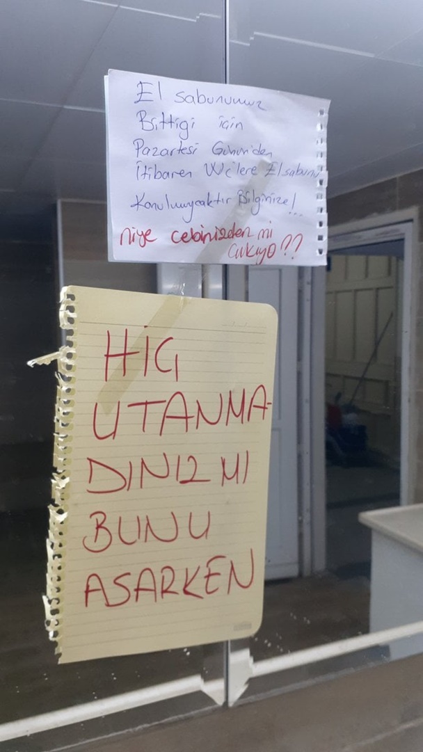 Tuvaletlere el sabunu konmayacağı yönünde bir uyarı yazısı asılmış. Öğrencilerde bu duruma yine aynı yöntemle ‘Hiç utanmadınız mı bunu asarken?’ şeklindeki sözlerle karşılık vermişler