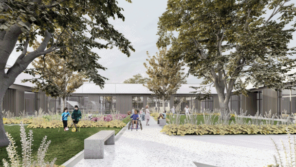 Yine zemin katta bağımsız yaşam evi, spor salonu, hidroterapi havuzu, bay bayan soyunma-duş alanı, depo, yemekhane, mutfak, öğretmenler odası, mescid, wc-lavabo, destek personel odası, depo, zihinsel engelliler grubu, koordinatör odası, duyu bütünleme odası, otizm grup eğitim odası, otizm bireysel eğitim odası, çocuk dinlenme odası ve oyun odası projede planlandı. Ayrıca bireyler ve çocuklar için terapi ve hobi amaçlı 875 metrekare ve 450 metrekarelik 2 adet avlu ve bir adet çocuk oyun alanı bulunuyor.