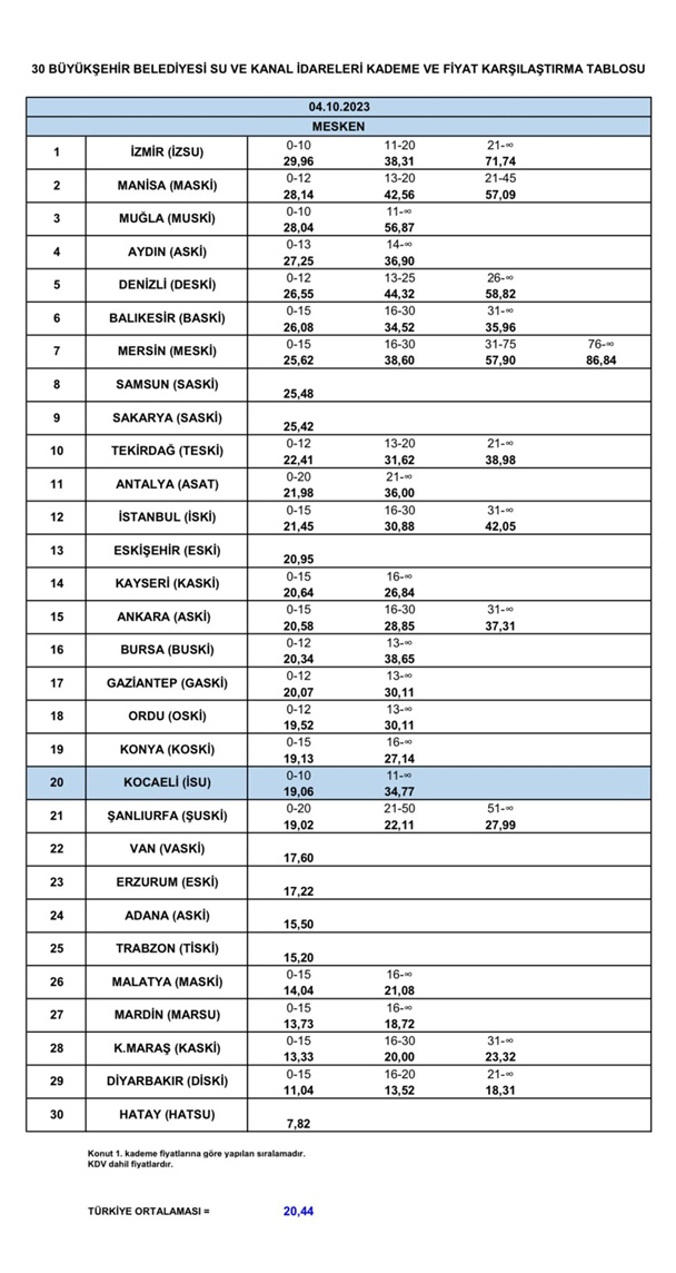 Şunu ifade edelim: 10 ton suya kadar evet, Kocaeli 20. sırada. Peki, 10 tondan sonra durum ne? Kocaeli, 10 tondan sonra suyun en pahalı olduğu illerden birisi. Birkaç örnek vereyim: 10 tondan sonra İstanbul’da su fiyatı 30,88 TL, Ankara’da ise 28,85… Kocaeli’de ise 34,77 TL…