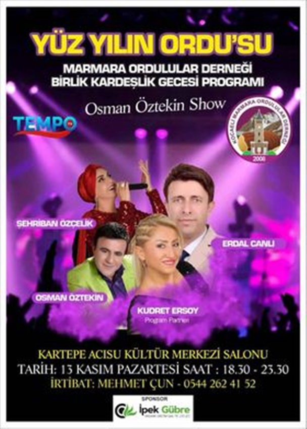 Kocaeli Marmara Ordulular Derneği tarafından planlanan ve Kartepe Acısu Kültür Merkezi’nde gerçekleştirilecek başlama 18.30 olan Yüz Yılın Ordusu Birlik Beraberlik Gecesi adı altındaki organizasyonda Şehriban Özçelik, Osman Öztekin, Kudret Ersoy ve Erdal Canlı gibi müzik insanları sahne alacaklar.