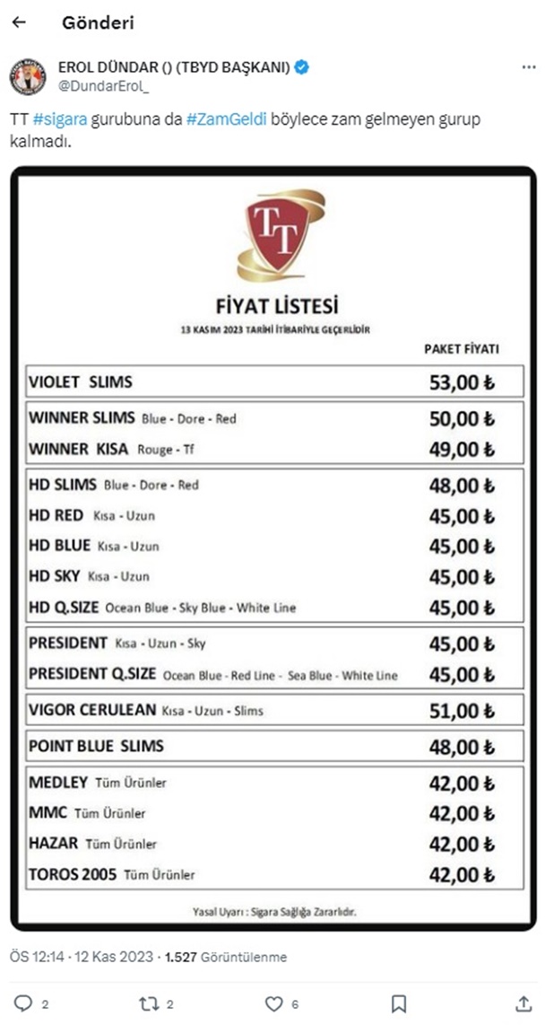 Tekel Bayileri Yardımlaşma Derneği Başkanı Erol Dündar, sosyal medya hesabından bir sigara grubuna daha zam geldiğini ve böylece zam yapmayan grup kalmadığını açıkladı.