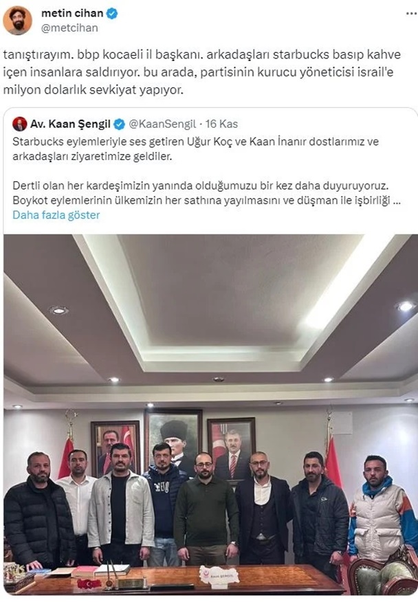 BBP Kocaeli İl Başkanı Kaan Şengil ise Metin Cihan’ın paylaşımını alıntılayarak, “Kim ki İsrail ile ticaret yapıyor benim hasmımdır. Kim olursa olsun!!!” dedi.