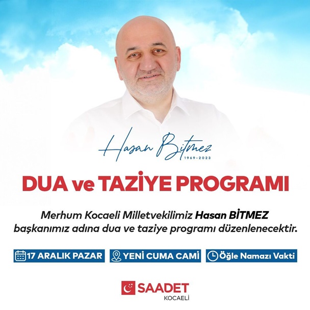 Saadet Partisi Kocaeli İl Başkanlığı olarak Merhum Milletvekilimiz Hasan Bitmez için 17 Aralık Pazar Günü, Yeni Cuma Camiinde (Pertev Paşa Cami) öğlen namazından sonra dua ve taziye programı gerçekleştirilecektir. Tüm vatandaşlarımız davetlidir.