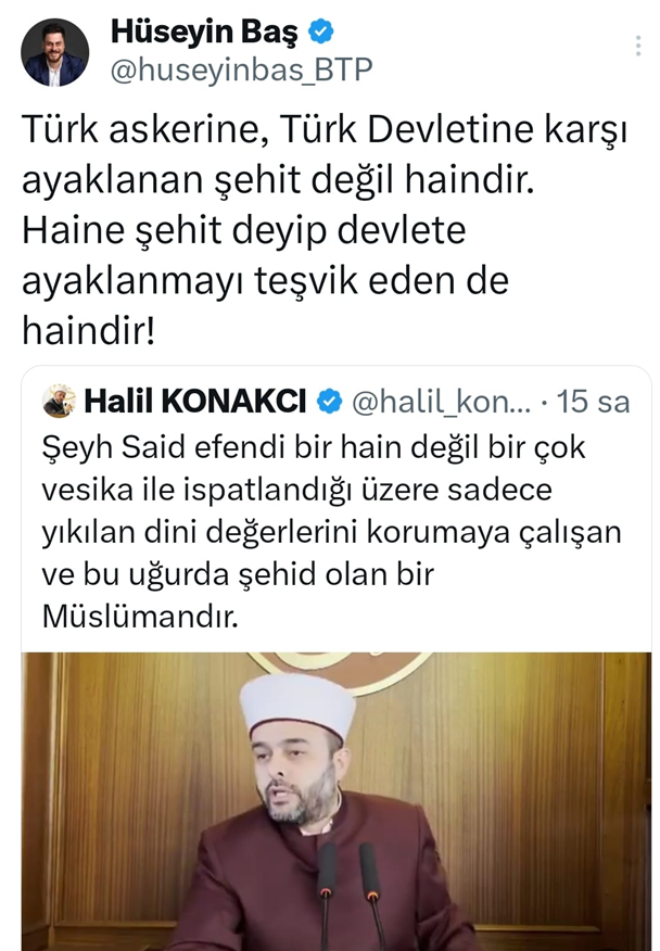 Bağımsız Türkiye Partisi (BTP) Genel Başkanı Hüseyin Baş, Türkiye Cumhuriyetine karşı isyan hareketi başlatan Şeyh Said için ‘şehit’ ifadesini kullanan Halil Konakçı isimli imama tepki gösterdi.
