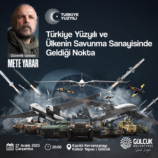 Türkiye, son yıllarda kamu ve özel sektör iş birliğiyle gerçekleştirdiği yüksek teknolojiye sahip yüzlerce ürünle, Dünya’da savunma sanayisinde önemli bir güç haline geldi. Bu başarıyı değerlendirmek ve geleceğe yönelik perspektif sunmak amacıyla, Güvenlik Uzmanı ve Yazar Mete Yarar, Gölcük Belediyesi tarafından düzenlenecek; "Türkiye Yüzyılı ve Ülkenin Savunma Sanayisinde Geldiği Son Nokta" konulu bir panele katılacak. 27 Aralık Çarşamba günü saat 20.00’de Kazıklı Kervansarayı Kültür Yapısı’nda düzenlenecek panelde; Mete Yarar, Türkiye’nin savunma sanayisi hakkında önemli bilgiler paylaşacak.