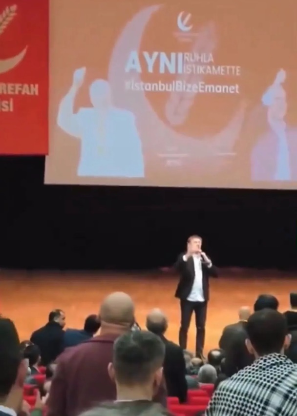 Yeniden Refah Partisi il divanında, AKP’li Bahçelievler Belediye Başkanı Hakan Bahadır konuşma yaparken salonda gerginlik çıktı. Yeniden Refah Partisi teşkilatları, Bahadır’ı ıslıklayıp yuhalamaya başladı. Konuşmasını tamamlamaya çalışan Hakan Bahadır, salonda bulunanlara, “Dinleyeceksiniz. Saygı duymayı öğreneceksiniz” ifadeleriyle tepki gösterdi.